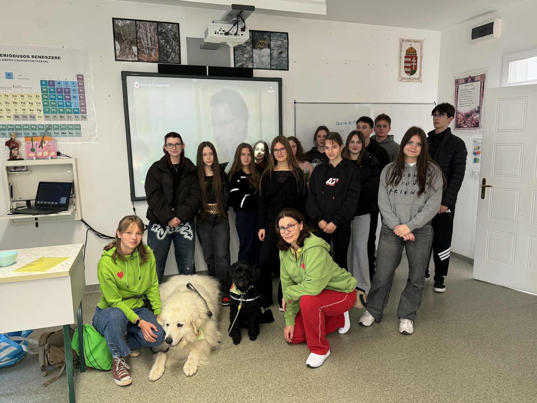 Szeretet, barátság, társ, nyugalom, kedvesség, hűség, bizalom. A kutyákra asszociálva ezeket a szavakat is felírták a táblára a 9.any és a 9.a osztály biológia tagozatos diákjai, amikor a Kutyával Egy Mosolyért Alapítvány képviselői iskolánkba látogattak. Panka és Lola jól képzett intézményi segítőkutyák. Nyugodtak, barátságosak és végtelenül kedvesek. Amellett, hogy azonnal szívünkbe zártuk őket, megtudtuk, hogy […]