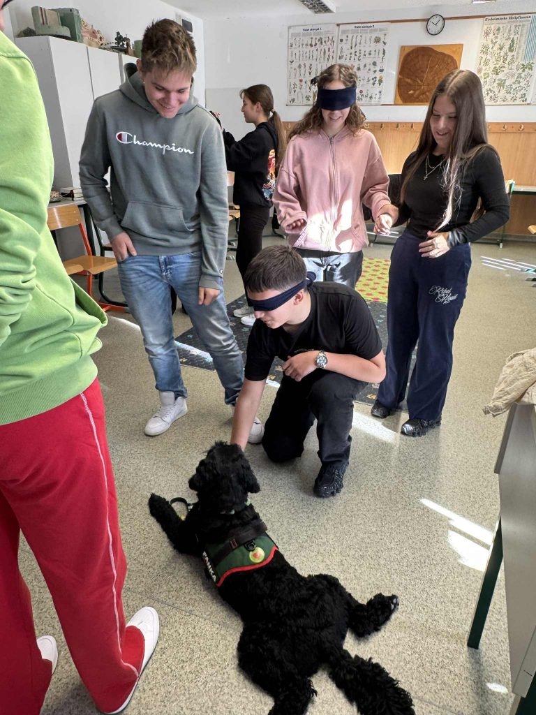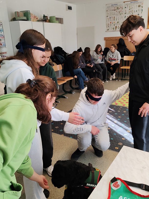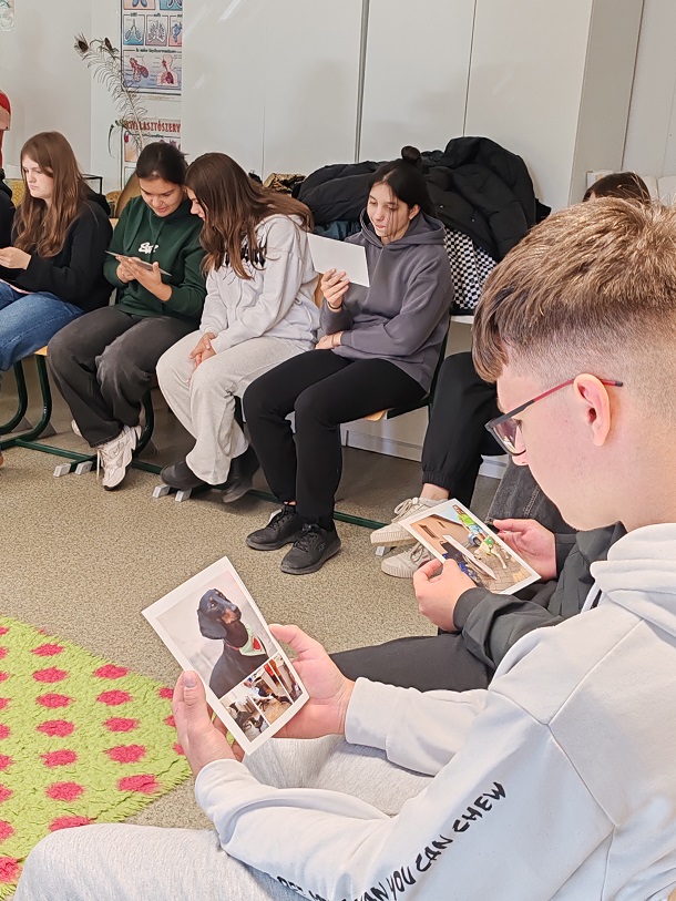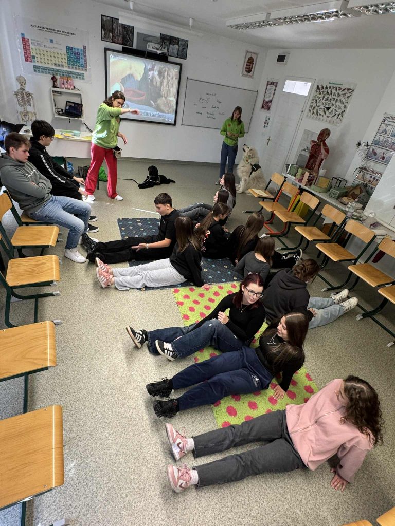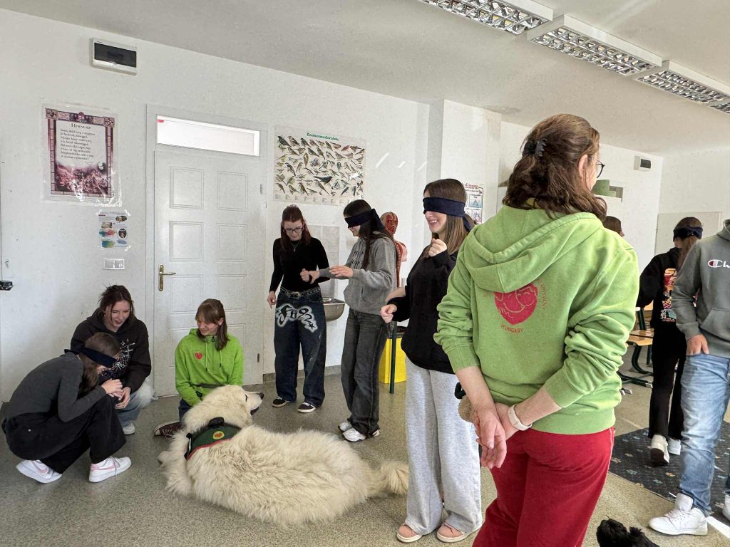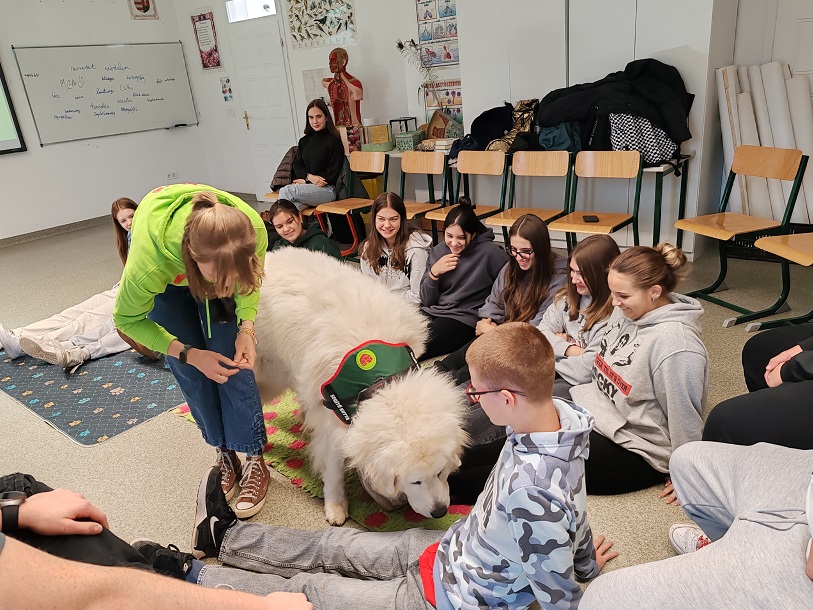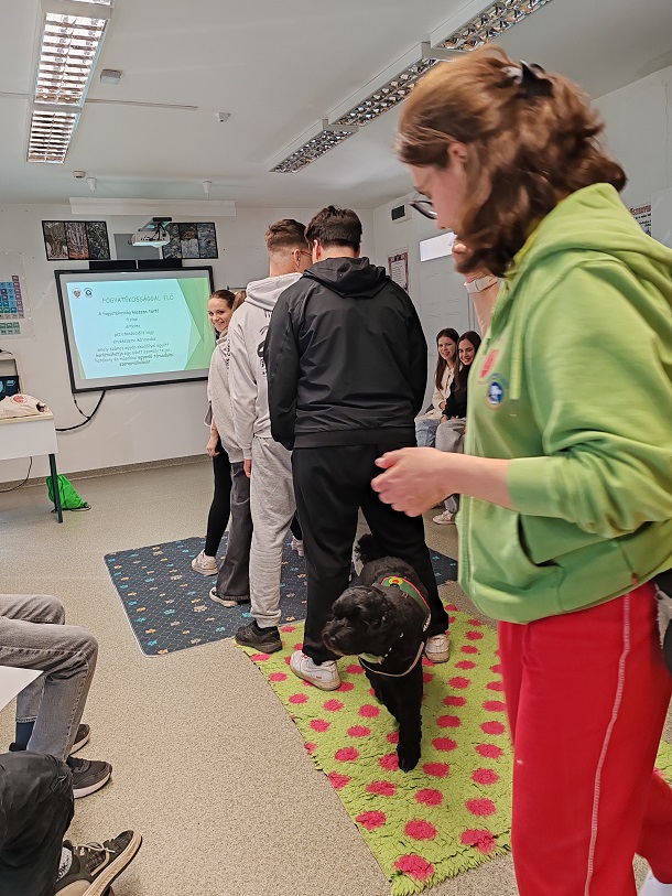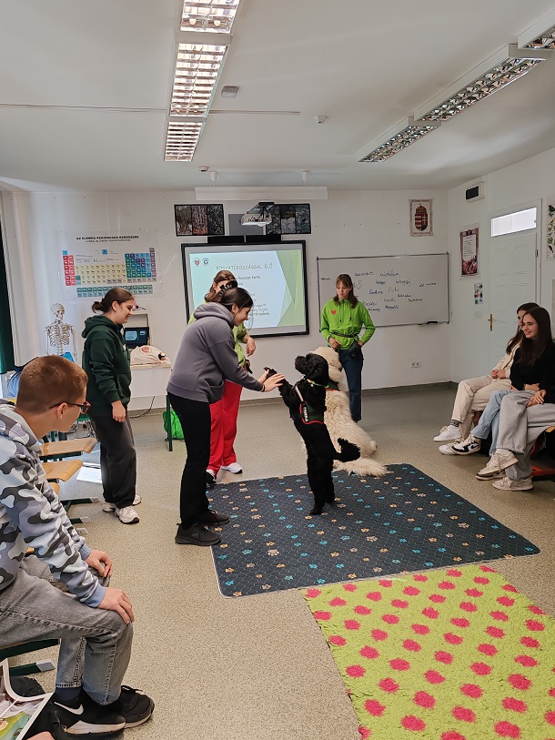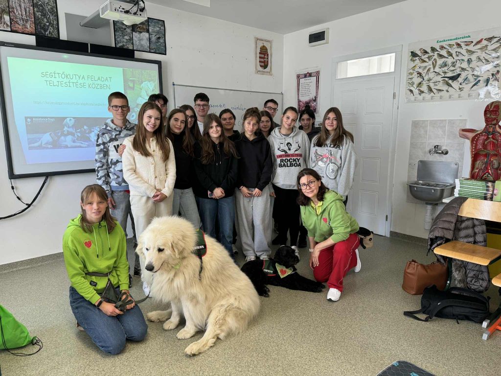 Szeretet, barátság, társ, nyugalom, kedvesség, hűség, bizalom. A kutyákra asszociálva ezeket a szavakat is felírták a táblára a 9.any és a 9.a osztály biológia tagozatos diákjai, amikor a Kutyával Egy Mosolyért Alapítvány képviselői iskolánkba látogattak.